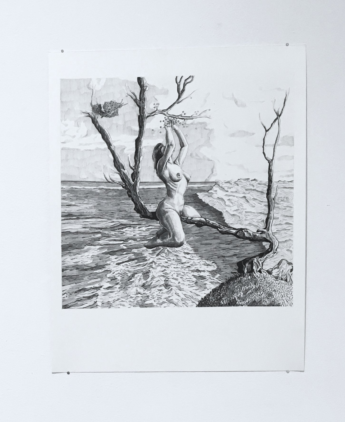 In this drawing, a figure balances herself on a narrow branch of an oddly shaped tree on the edge of a cliff. An expansive landscape extends in the distance. She hovers over an ocean as she reaches up to grab some berries. The tree supports her weight as her labia wraps around the branch. Is this an uncomfortable or pleasurable situation?
