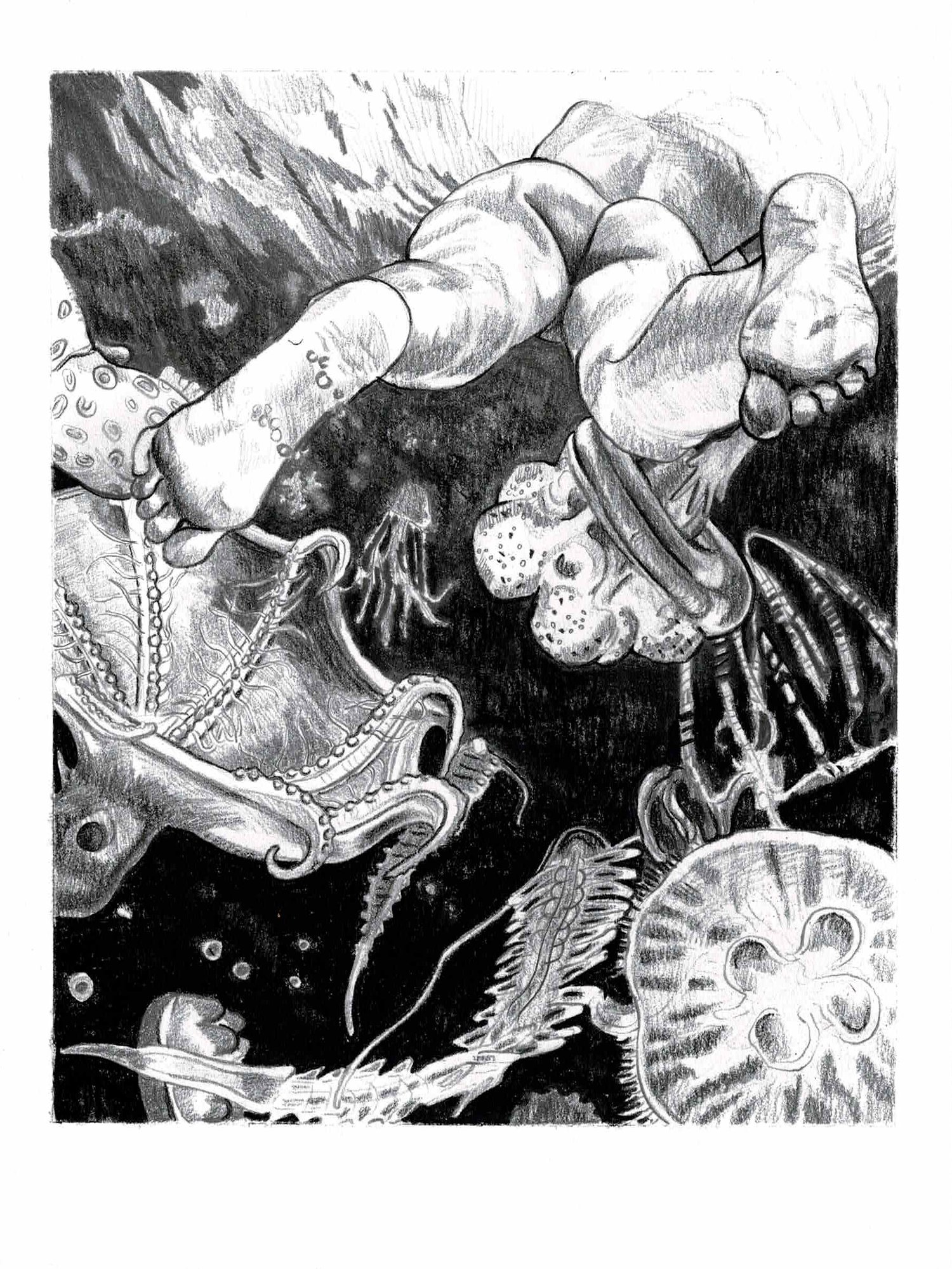 In this drawing, we are submerged in the ocean's depths and see a figure swimming above us. Various sea creatures surround the figure. Is she aware the creatures are there? Is she swimming among them or away from them?