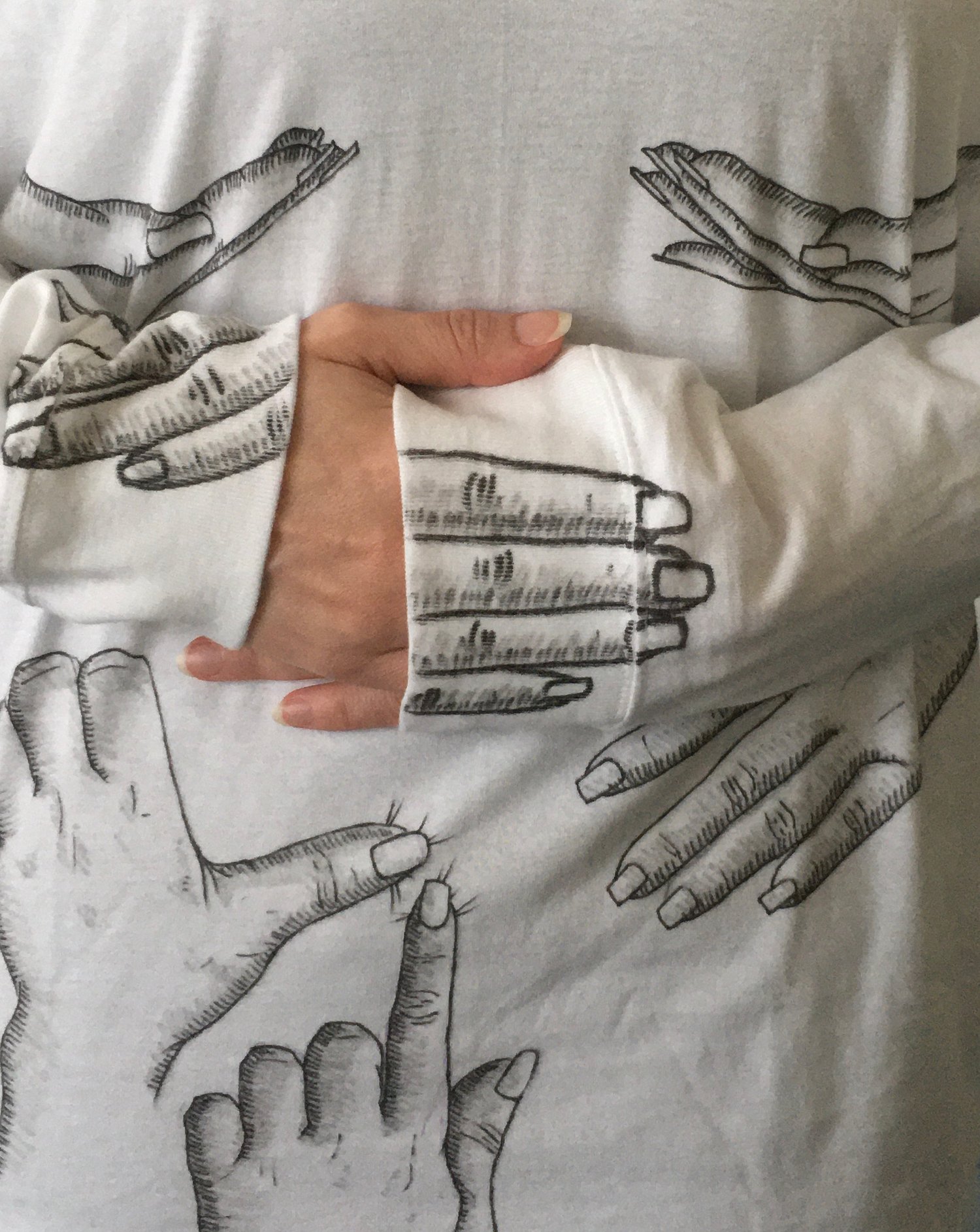 Inspired by some of my older charcoal drawings, which included numerous hands touching, probing, and opening bodies, transposing these on clothing has been a great medium to emphasize some of the concepts behind it.
