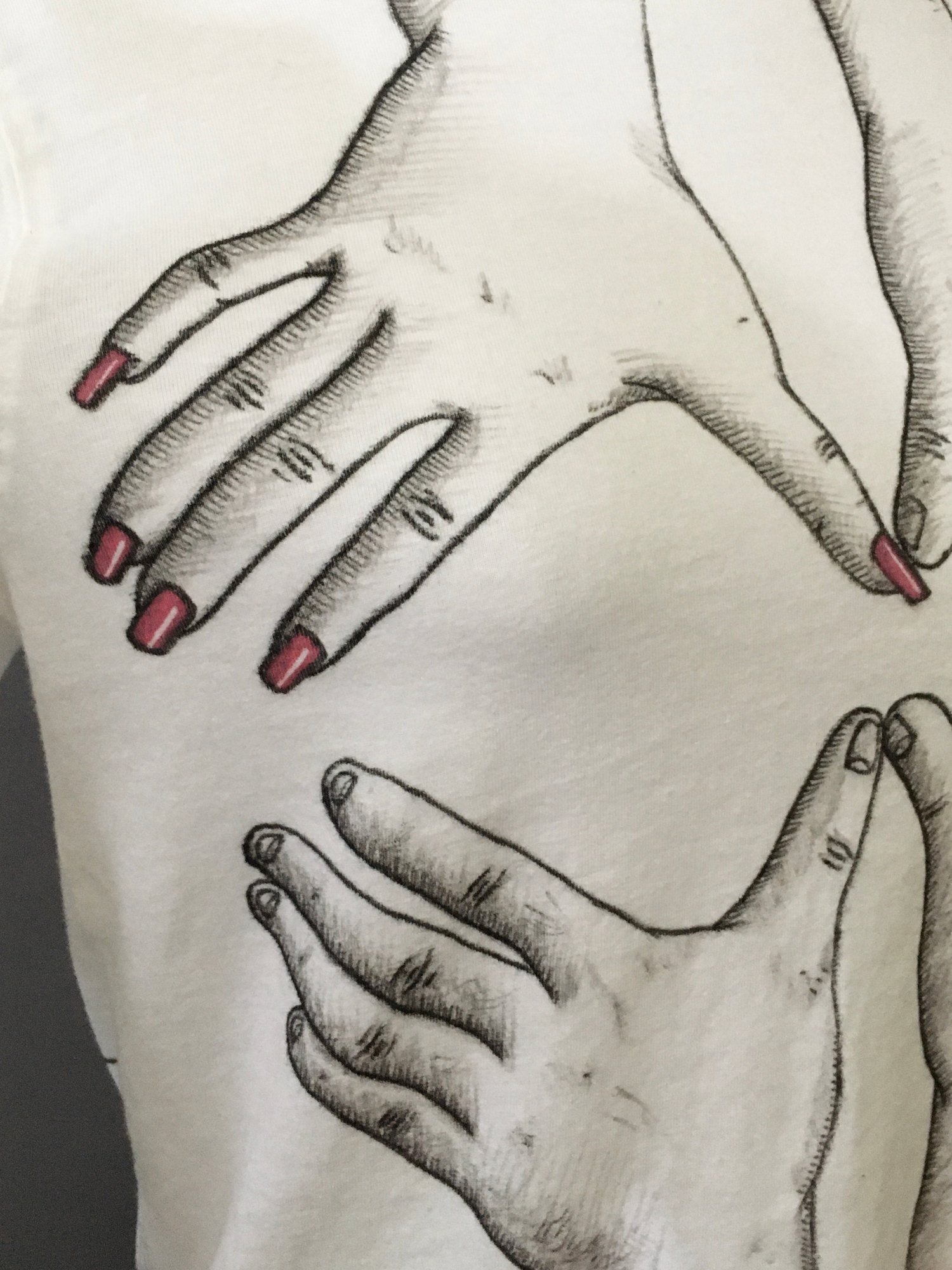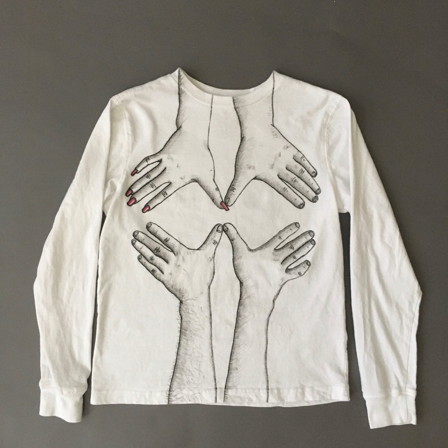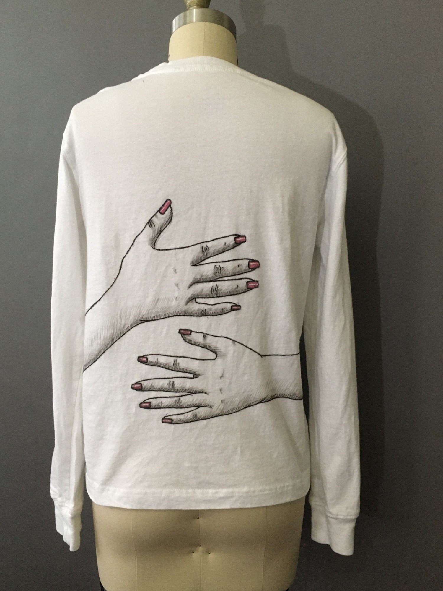 Inspired by some of my older charcoal drawings, which included numerous hands touching, probing, and opening bodies, transposing these on clothing has been a great medium to emphasize some of the concepts behind it.