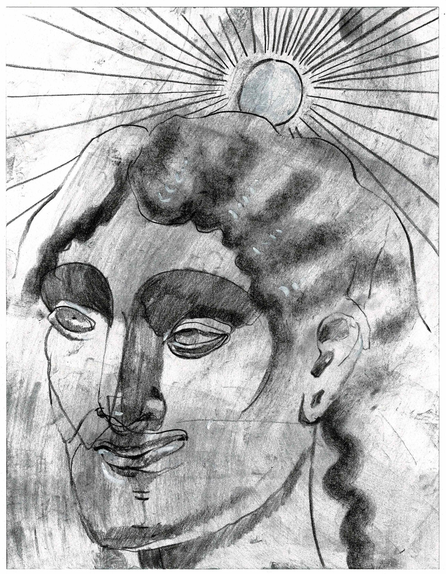 Challenging myself through the medium has been exciting by keeping other parameters constant. All drawings depict heads and faces; so far, they are all vertical, 11 x 8.5 inches, although I plan on working on other sizes. Some are just graphite; others combine various mediums. Many are a combination of faces created through imagination and memory; some are inspired by Greek, Egyptian, and Roman classical sculptural heads, and others I have literally printed my face on the page. The drawings that don't excite me get cut up and collaged into other pictures. I am continuously thinking of light beams, glows, shadows, sparks, wind, fog, movement, and stillness and how all these different factors affect light.