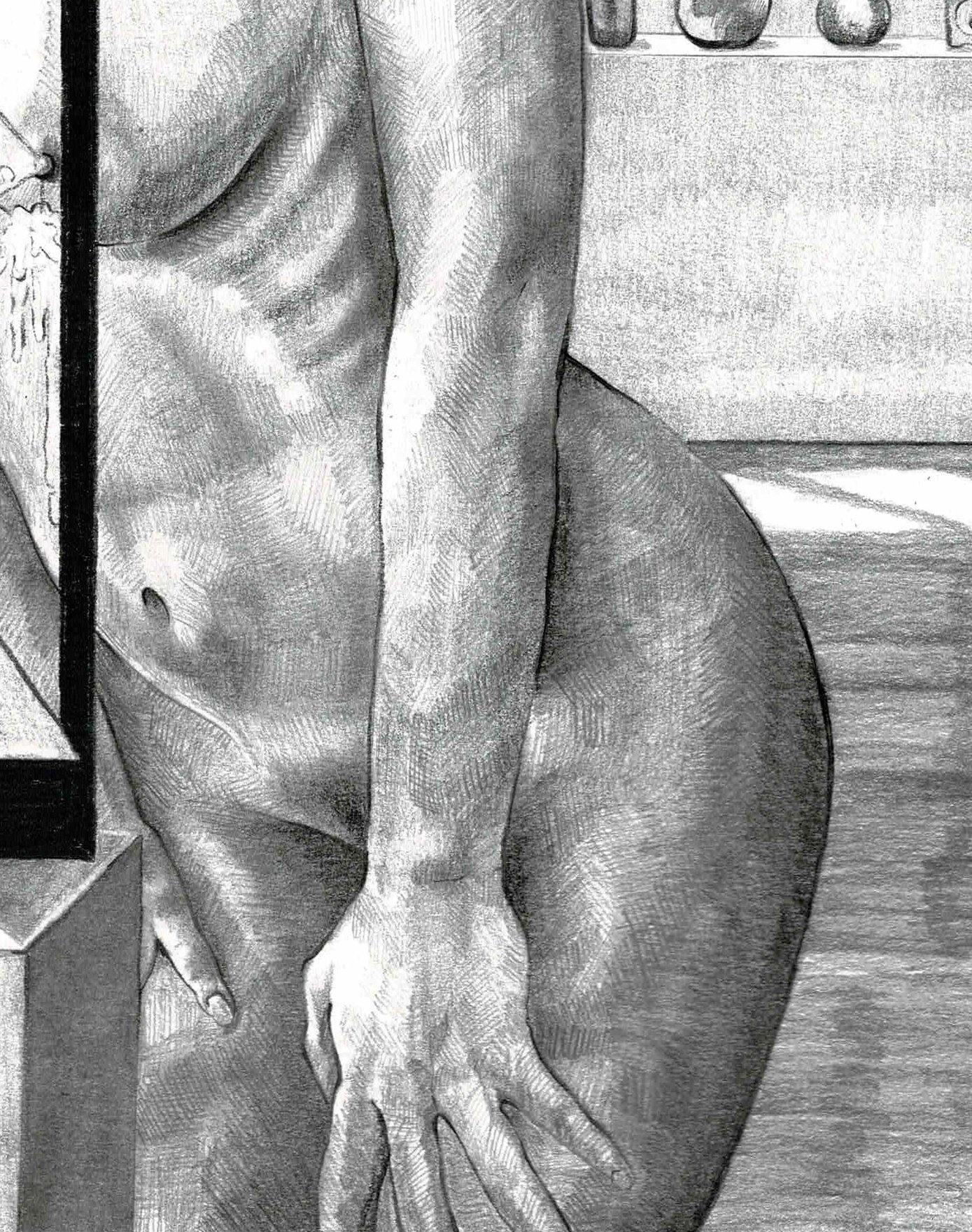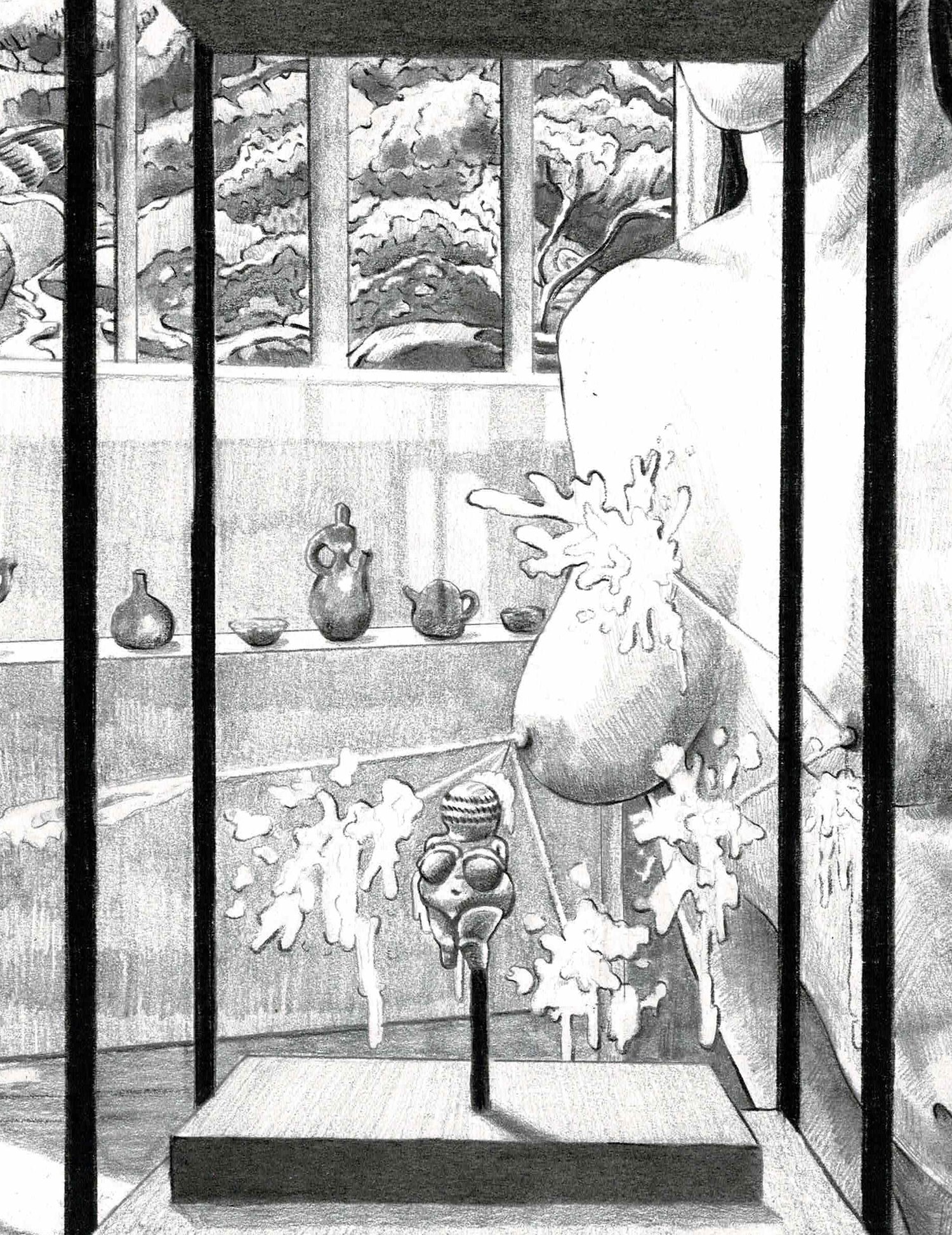 Venus is about listening to the primal, wild female creator within and around us. The drawing depicts the interior of a sun-lit museum room. We can see several "woman as vessel" artifacts exhibited on pedestals in the open. The tiny Venus of Willendorf stands enclosed in a large glass case in the foreground. A nude female figure stands by the case as milk shoots out from her breasts towards the little Venus and drips down the glass. Did the little fertility Venus evoke a lactating spurt from the figure? Or is the woman trying to awaken the little twenty-five thousand-year-old fertility Venus, who once lived in a primitive natural environment but is now being held in a sterile case?